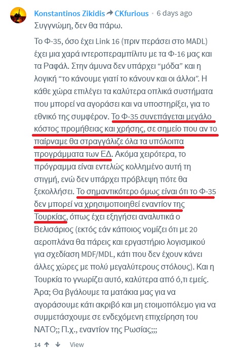 Αυτά είναι τα λόγια του Σμήναρχου Ζηκίδη σχετικά με άρθρο που κυκλοφόρησε από την Πτώση & Διάστρεμμα για να διώξουμε τα Mirage 2000-5 κι έψαξα να δω τι λέει και μια ψυχή που υπηρετεί σε αυτά μήπως κατάλαβα κάτι λάθος. Μάλλον δεν κατάλαβα λάθος.Να χεστούν πάνω τους οι Τούρκοι στην πιθανότητα των +36 Mirage2000-9 για την ΠΑ, απολυτά λογικό.
