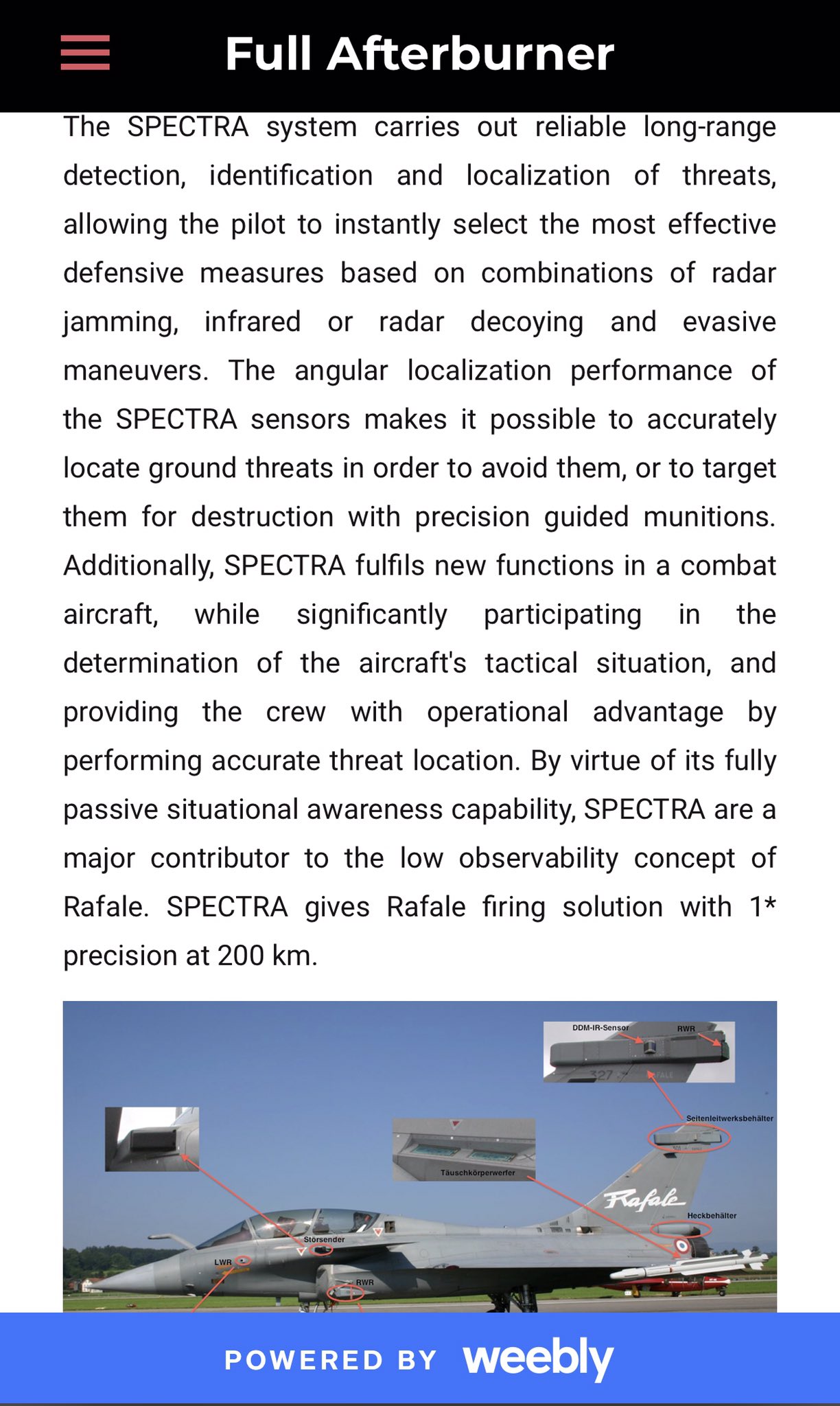 Το Rafale έχει data fusion μεταξύ του AESA RBE 2,του SPECTRA και του OSF. Μπορεί να αναγνωρίσει τον εγκλωβισμό του από εχθρικό ραντάρ εδάφους από 200 χλμ,να το απεικονίσει με το SAR,να το εγκλωβίσει και να το καταστρέψει με AASM,που έχει μεγάλη και πλήρως περιμετρική εμβέλεια.