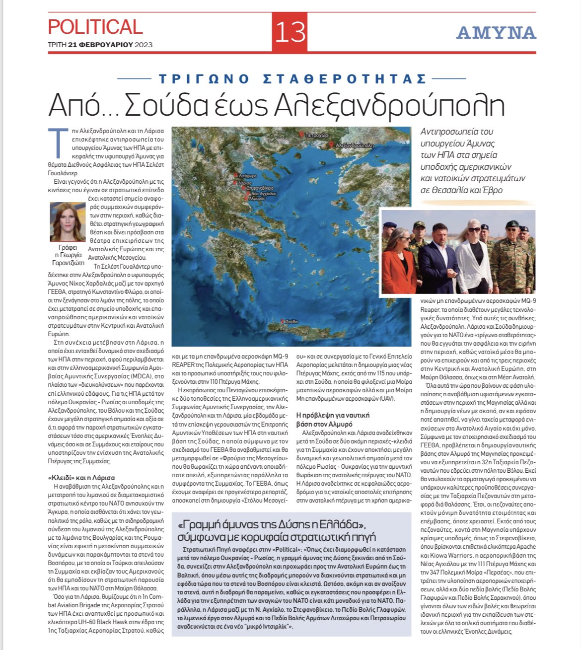 Το στρατηγείο της ΧΙΙ Μηχανοκίνητης Μεραρχίας Πεζικού, τις εγκαταστάσεις του λιμανιού της Αλεξανδρούπολης και την 110 Πτέρυγα Μάχης στη Λάρισα, επισκέφθηκαν χθες ο υφυπουργός Εθνικής Άμυνας Νίκος Χαρδαλιάς και η υφυπουργός Άμυνας για Θέματα Διεθνούς Ασφάλειας των ΗΠΑ Δρ. Σελέστ Γουαλάντερ, συνοδευόμενοι από τον Αρχηγό ΓΕΕΘΑ Στρατηγό Κωνσταντίνο Φλώρο.