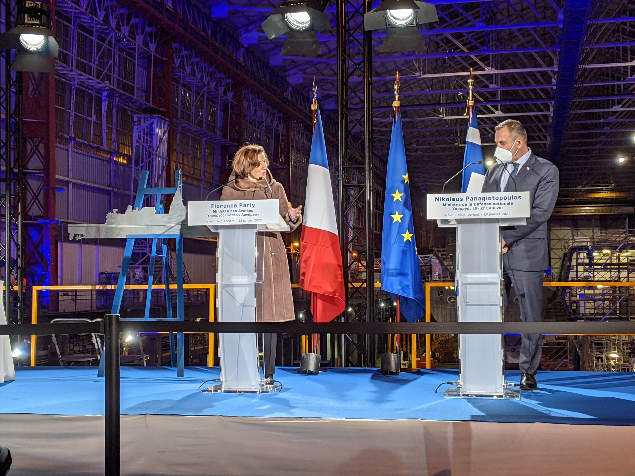 "to your right is the first FDI [...] This first frigate will be delivered to the French Navy as early as 2024. The next two vessels will be delivered, we hope, to the Hellenic Navy, in 2025!"