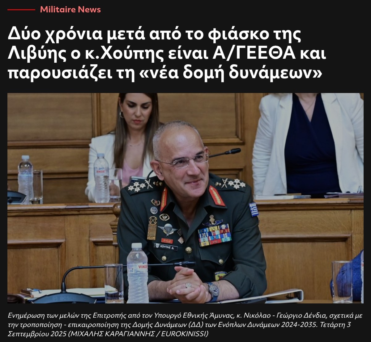 Στην φωτο κάτωθεν ο "ήρωας" του Μητσοτάκη και της ΝΔ, ο πολυπαρασημοφορημένος αλλά άκαπνος από μάχη Χούπης. Ο επί κεφαλής του σχεδιασμού του φιάσκου της Λιβύης, εξηγεί τον μειοδοτικό ανασχεδιασμό των ΕΔ. Κρίθηκε κατάλληλος για στρατηγός εε και ΑΓΕΕΘΑ.